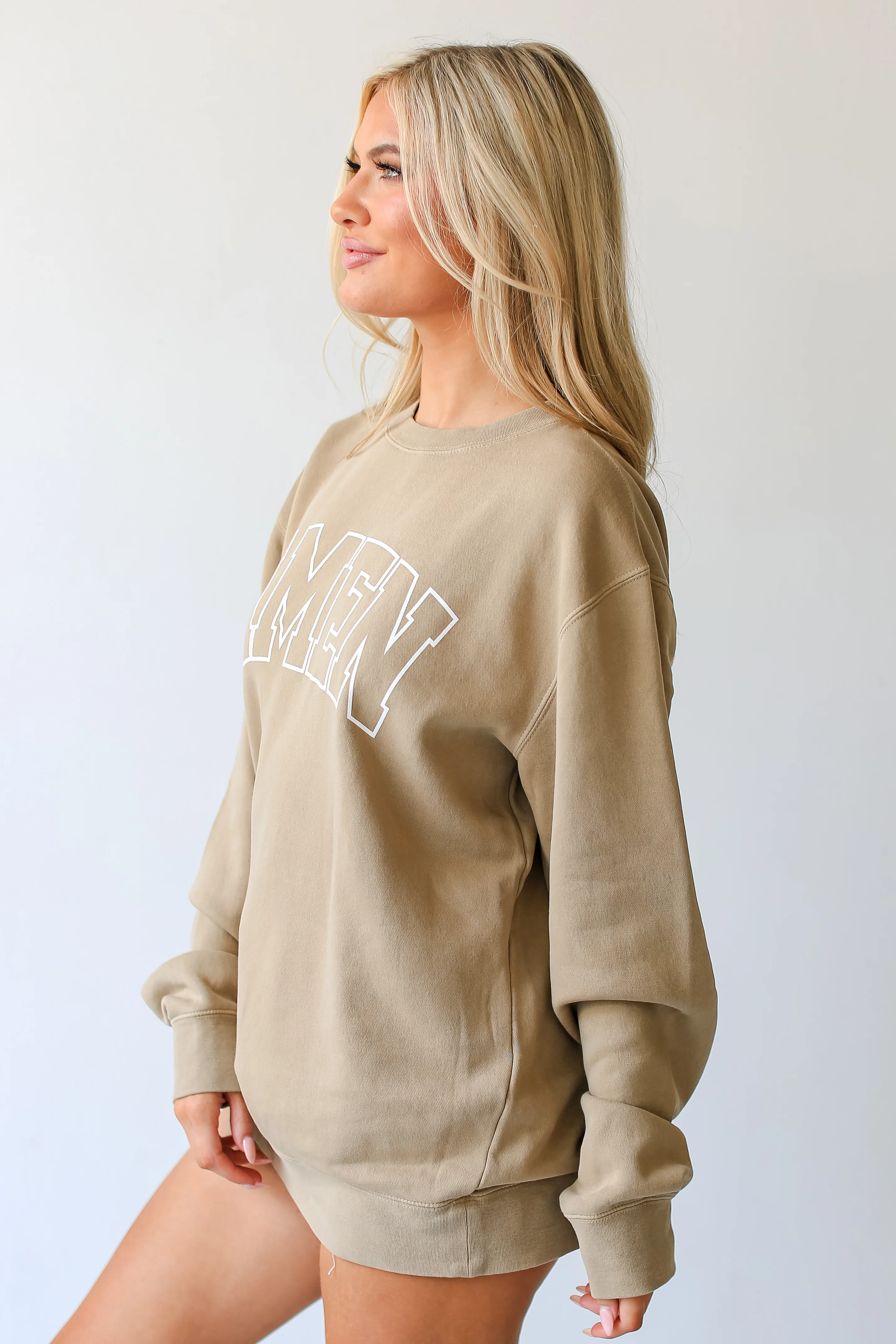We love the message on the Tan Amen Sweatshirt! This comfy sweatshirt is designed with a soft and stretchy knit with a fleece interior. It features a crew neckline, long sleeves, a relaxed fit, and the word "Amen" on the front. Style the Tan Amen Sweatshirt with your favorite denim and sneakers for a casual look!
